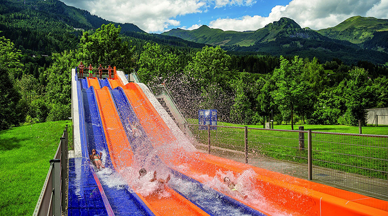 这是一款主打竞速体验的多人水滑梯设备,以橙蓝撞色的四道并行滑道为核心,架设于青山草坪之间,视觉上充满活力与动感,与周边自然景致形成鲜明的夏日氛围。