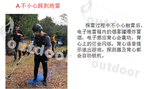 参与者身穿迷彩服,手持探测仪在特定的“雷区”训练场地间穿梭奋战,好比一场真实的战斗给人带来无比的刺激与成就感。“排雷兵”可以模拟爆炸及振动,队员在触雷阵亡后有振动、音响、灯光显示,并且中央控制器可以同公共广播及时播报阵亡人数及名单。时间、排雷难度等均可随意设定,可以及时了解及控制团队进程。