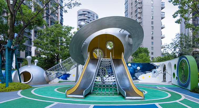 这是一款以 “外星飞碟着陆” 为设计灵感的户外滑梯游乐设备,通体采用金属质感的银色飞碟造型,搭配暖黄色的内部舱体,周围的星空彩绘地面进一步强化了未来感与太空氛围。