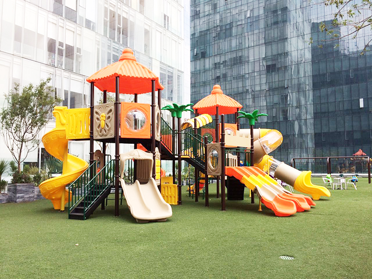 设备集多元游乐功能于一体:多条不同坡度的滑梯满足多样滑行体验,攀爬网、钻行通道与互动面板可锻炼孩子的肢体协调力与探索欲,开阔的平台设计也为社交互动提供了空间。它采用环保耐用的户外材质,全圆角安全设计保障游玩安全,适合安置在社区绿地、商业区户外、幼儿园等场景,既能让孩子在充满热带气息的游乐场景中释放活力,也能凭借明快的色彩成为场地的吸睛亮点。