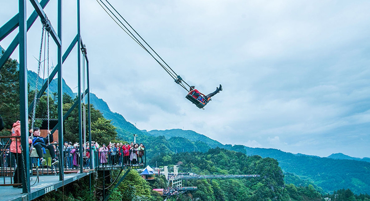 游客从悬崖边缘瞬间荡出,可在峡谷间体验失重感与风速冲击,360° 俯瞰层叠山林与幽深峡谷,带来兼具视觉震撼与感官刺激的沉浸式体验。设备采用专业级钢索、五点式安全带与多重缓冲装置,搭配定期安全检测机制,全方位保障游玩安全。